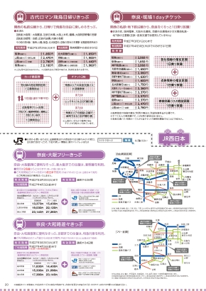 ※掲載されている情報は、平成26年11月1日現在の情報です。内容が変更される場合がございますので、お出かけの際にはご確認ください。JR西日本奈良・大阪フリーきっぷ●お求め・お問い合わせは、出発駅周辺のJR西日本の主な駅のみどりの窓口、主な旅行会社へどうぞ。下記の詳しい情報は、駅のパンフレットまたはをご覧ください主な出発地からのおねだん(おとなお一人様あたり/こども料金は半額)※こどものみのご利用はできません。13,370円15,430円19,030円22,120円23,140円27,260円普通車用グリーン車用※他に倉敷、新倉敷、福山、三原、徳山、下関、北九州市内・福岡市内の発着駅がございます。※普通車用は新幹線(「のぞみ」「みずほ」号含む)の普通車指定席、グリーン車用は新幹線(「のぞみ」「みずほ」号含む)のグリーン車指定席がご利用いただけます。岡山発着広島市内発着新山口発着新大阪までの往復新幹線(「のぞみ」「みずほ」号含む)〈普通車指定席またはグリーン車指定席〉※他に敦賀、武生・鯖江、芦原温泉、加賀温泉、小松、高岡、魚津、七尾の発着駅がございます。※普通車用は特急列車の普通車指定席、グリーン車用は特急列車のグリーン車指定席がご利用いただけます。※北陸線・湖西線経由でのご利用となります。米原経由でのご利用はできません。●発売は2名様からとなります(同一行程に限ります)●ご利用開始日の1ヶ月前から前日まで発売(平成27年4月1日(水)出発分まで発売)※ご利用日当日の発売はいたしません。奈良・大阪散策に便利なきっぷ。新大阪までの往復は、新幹線を利用。発売期間ご利用期間発売期間ご利用期間平成27年3月31日(火)まで平成27年4月3日(金)まで有効期間連続する3日間奈良・大和路遊々きっぷ●ご利用開始日の1ヶ月前から当日まで発売(平成27年3月31日(火)出発分まで発売)奈良・大和路散策に便利なきっぷ。京都までの往復は、特急列車を利用。平成27年3月31日(火)まで平成27年4月3日(金)まで有効期間連続する4日間奈良交通奈良・大阪での鉄道(JR・近鉄)・バス(奈良交通)の自由周遊区間乗り放題主な出発地からのおねだん(おとなお一人様あたり/こども料金は半額)※こどものみのご利用はできません。11,830円14,400円15,330円21,090円17,380円23,140円普通車用グリーン車用福井発着金沢発着富山発着京都までのJR往復特急列車(普通車指定席またはグリーン車指定席)奈良・大和路フリー区間の近鉄線4日間乗り放題奈良・大和路フリー区間のJR線4日間乗り放題(普通・快速列車普通車自由席)奈良交通奈良・大和路での鉄道(JR・近鉄)・バス(奈良交通)のフリー区間乗り放題20●お求めは、阪神電車、大阪市交通局、京都市交通局ほか主な関西私鉄・地下鉄の主要駅(近鉄・奈良交通では発売していません)各社局線の指定区間1日乗り放題近鉄電車の指定区間1日乗り放題奈良交通バスの指定区間1日乗り放題発売期間有効期間発売額※座席指定の特急列車をご利用の場合は、別途特急料金が必要です。※すべて大人の発売額です。こども用の設定はありません。※奈良交通バス・生駒ケーブルから当チケットの使用を開始することはできません。阪急沿線から阪神沿線から神戸高速沿線から山陽沿線から@(明石以東)山陽沿線からA(全線)神戸市営地下鉄沿線から能勢沿線から北大阪急行沿線から神戸電鉄沿線から大阪モノレール沿線から南海・泉北沿線から大阪市交通局沿線から京阪沿線から京都市営地下鉄沿線から平成27年3月31日(火)まで平成27年4月30日(木)までのお好きな1日間奈良・斑鳩1dayチケット2,060円1,850円2,060円1,650円2,060円1,630円1,600円1,750円2,260円2,370円2,570円2,370円2,470円2,780円大人大人大人大人大人大人大人大人大人大人大人大人大人大人(12/28〜1/6の利用を除く)奈良・大和路フリー区間の奈良交通路線バス4日間乗り放題(指定路線)奈良・大阪自由周遊区間の近鉄線3日間乗り放題奈良・大阪自由周遊区間のJR線3日間乗り放題(普通・快速・新快速列車普通車自由席)奈良・大阪自由周遊区間の奈良交通路線バス3日間乗り放題大阪新大阪尼崎桜島大阪難波JR難波天王寺大阪阿部野橋大和西大寺平城山秋篠寺法華寺平城浄瑠璃寺般若寺奈良桜井布施鶴橋大和八木石舞台壷阪寺前吉野室生口大野談山神社室生寺大和二見吉野口高田壺阪山法隆寺法隆寺前矢田寺前近鉄郡山橿原神宮前王寺天理白毫寺萩ヶ丘町大仏殿春日大社前JR近鉄奈良交通バスJRから近鉄へ乗換えできますJRから近鉄へ乗換えできますJRから近鉄へ乗換えできますJRから近鉄へ乗換えできます京橋JRから近鉄へ乗換えできます古市近鉄奈良[自由周遊区間][フリー区間]●お求め近鉄版(大阪発):大阪難波、近鉄日本橋、大阪上本町、鶴橋、大阪阿部野橋の各駅近鉄版(京都発):京都、近鉄丹波橋、向島の各駅その他の各社版:阪神、山陽、阪急、北大阪急行、京阪の各社の主要駅・定期券発売所ほか発売期間有効期間関西の私鉄沿線から、日帰りで飛鳥を自由に楽しめるきっぷ。関西の私鉄・地下鉄沿線から、奈良をぐるっと1日乗り放題!各社線の指定発
