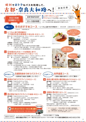 21奈良交通奈良大和路定期観光バス1日もしくは連続2日間で2コース以上をご利用いただくと、2コース目以降の料金に連続乗車割引が適用されます。?バス運賃と拝観料がセットになってお得!?全コース、バスガイドがご案内!?出発保証!おひとりでもお気軽にご乗車できます。おすすめPOINT2コース目がお得!インターネットからもお申し込みいただけます。奈良交通定期観光バス検索注1)C・L2コースの()内料金は薬師寺玄奘三蔵院「大唐西域壁画」非公開期間12/1〜12/31、H27.1/16〜2/28(予定)の料金です。注2)※薬師寺東塔は、解体修理のため、ご覧いただけません。注3)L1コースとCコースは同一車両で運行したします。古都奈良ゆうゆうバスラインお問合せ・お申込み奈良交通総合予約センター?0742-22-5110または奈良交通東京支社?03-5652-5780(8:30〜19:00年中無休)〜目的地で自由に散策したい方に〜〜いつもと違う冬の奈良を〜斑鳩ゆうゆうバスライン【半日コース】運行期間:平成27年3月31日まで毎日料金:大人3,000円小児1,430円出発時刻:JR奈良駅/9:55近鉄奈良駅/10:00解散時刻:12:40頃(約2時間45分)コース:法隆寺・中宮寺(拝観後解散・自由散策)☆見学後、L1コース乗車券の提示で最寄駅まで路線バスにご乗車いただけます(当日1乗車に限る)。L1いつもと違う奈良観光!プチ贅沢な冬の奈良旅【午前出発・半日コース】U1B奈良公園3名所と春日奥山めぐり【半日コース】運行期間:平成27年3月31日まで毎日(12月14日は運休)料金:大人4,000円小児2,150円出発時刻:JR奈良駅/9:05近鉄奈良駅/9:10終了時刻:12:50頃(約3時間45分)コース:東大寺〜春日大社〜興福寺〜若草山(車窓)〜春日山原始林(車窓)〜JR・近鉄奈良駅☆乗車記念品付きL2西の京ゆうゆうバスライン【午後発・半日コース】運行期間:平成27年3月31日まで毎日料金:大人2,500円(2,200円)小児1,060円(960円)出発時刻:JR奈良駅/13:55近鉄奈良駅/14:00終了時刻:17:00頃(約3時間)コース:唐招提寺〜薬師寺※(拝観後解散・自由散策可)〜朱雀門(車窓)〜JR・近鉄奈良駅比較的徒歩の多いコースです季節コースおすすめコース〜奈良の観光地をたっぷりご案内〜人気のコース世界遺産コースC法隆寺・西の京【1日コース】運行期間:平成27年3月31日まで毎日料金:大人7,000円(6,700円)小児3,360円(3,260円)出発時刻:JR奈良駅/9:55近鉄奈良駅/10:00終了時刻:17:00頃(約7時間)コース:法隆寺・中宮寺〜慈光院(抹茶の賞味)〜薬師寺※〜唐招提寺〜朱雀門(車窓)〜JR・近鉄奈良駅昼食(別途料金)/法隆寺門前「冨之里」※ご希望の方は当日窓口でお申し込みください。☆乗車記念品付き比較的徒歩の多いコースです冬のおすすめコース運行日:平成27年2月8日(日)、14日(土)、15日(日)、3月7日(土)、8日(日)料金:大人6,000円連続乗車割引大人5,200円(旅行代金に含まれるもの/バス代、昼食代、拝観料、体験料)※小児料金の設定はございません。出発時刻:JR奈良駅/9:40近鉄奈良駅/9:45終了時刻:17:30頃(約8時間)コース:JR・近鉄奈良駅=東大寺(大仏殿・二月堂周辺)=昼食(茶がゆ御膳)=大神神社(拝殿・活日神社)…今西酒造(酒蔵見学・試飲)=三輪そうめん山本麺ゆう館(そうめんの手延べ体験、そうめん・葛もちの試食)=近鉄・JR奈良駅日本食文化のルーツは奈良にあり!奈良のうまいものめぐり【1日コース】U2奈良ホテルランチコースそうめんの手延べ体験今西酒造※写真はすべてイメージです※各日35席鹿寄せ当ツアーだけの奈良ホテルランチコースをご賞味!体験で手延した生素麺をお持ち帰り試飲のおちょこプレゼント※=はバス…は徒歩を表します運行日:平成27年2月6日(金)、7日(土)、21日(土)、22日(日)、28日(土)料金:大人4,500円小児3,870円、連続乗車割引大人4,100円小児3,670円(旅行代金に含まれるもの/バス代、昼食代)出発時刻:JR奈良駅/9:40近鉄奈良駅/9:45終了時刻:13:30頃(約4時間)コース:JR・近鉄奈良駅=春日大社境内飛火野(鹿寄せ観賞)…春日大社(本殿・夫婦大國社・一言主神社)=奈良ホテル(昼食・館内見学)=ならまち(13:15頃到着後解散可)=JR・近鉄奈良駅ボンネットバス「シーカくん号」運行!期間限定平成26年12月・平成27年1月16日〜31日・2月の土・日・祝日各日26名席